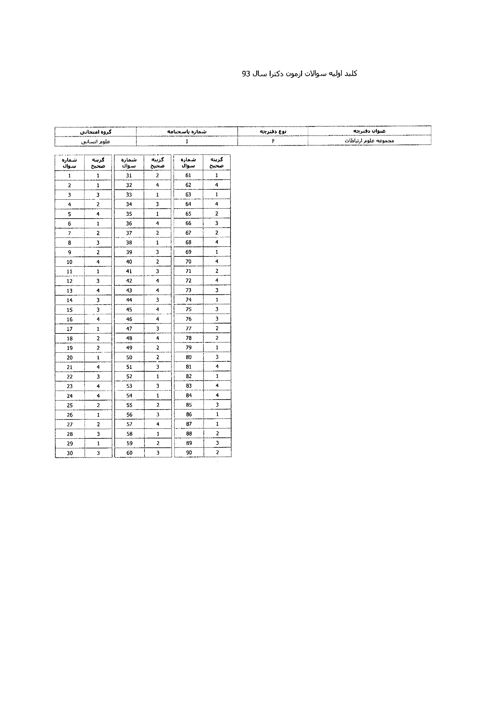 پاسخنامه تستی دکتری سراسری علوم ارتباطات (فرهنگ و ارتباطات - مطالعات رسانه، رادیو و تلویزیون) سال 13931393رایگان460KB