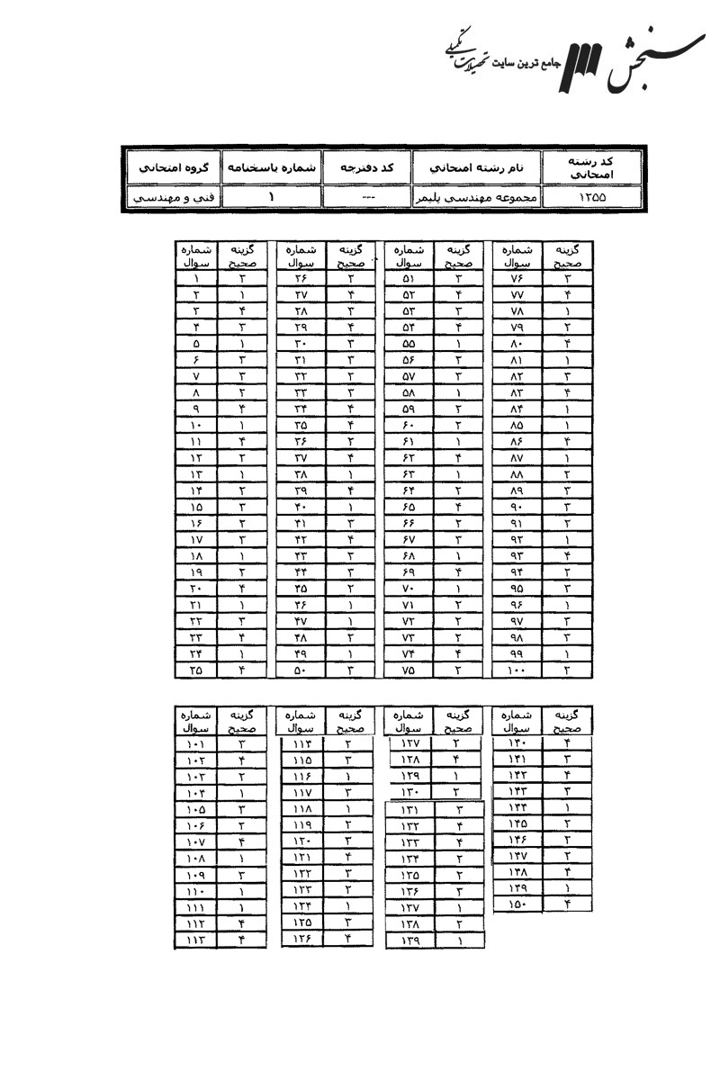 نمونه سوالات مهندسی پلیمر، شامل دروس زبان عمومی و تخصصی (انگلیسی) – شیمی پلیمر و مهندسی پلیمریزاسیون- ریاضیات مهندسی – تکنولوژی پلیم (الاستومر، پلاستیک، کامپوزیت) – شیمی فیزیک پلیمرها و خواص فیزیکی و مکانیکی پلیمرها – پدیده های انتقال (رئولوژی، انتقال حرارت، انتقال جرم) – کنترل فرایندهای پلیمری و مکانیک سیالات، جهت آشنایی داوطلبان با سوالات کارشناسی ارشد سراسری