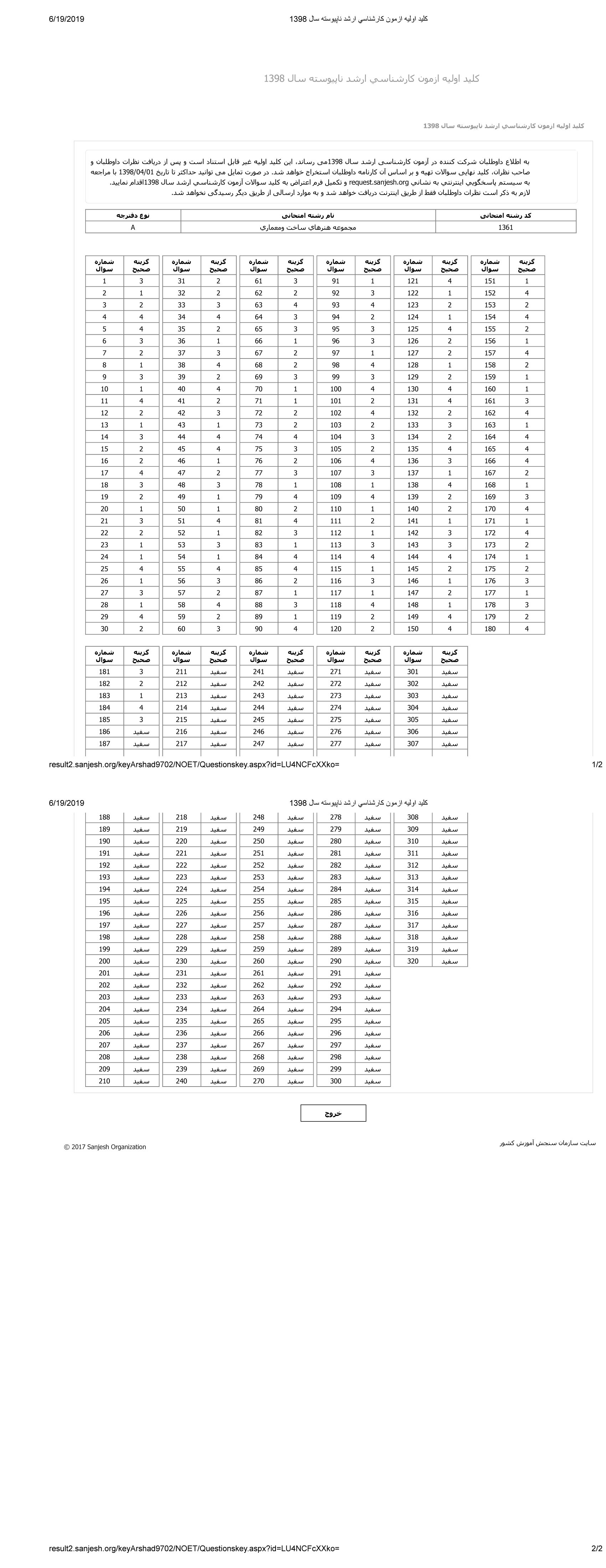 نام فایلسالقیمتحجم فایلنمونهتوضیحاتدریافتپاسخنامه تستی کارشناسی ارشد سراسری هنرهای ساخت و معماری1392رایگان200KB---